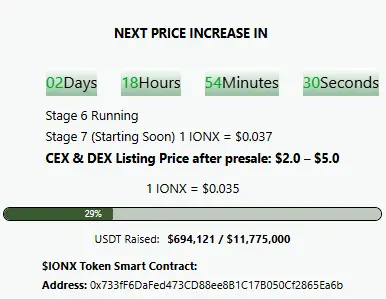 Ionix Chain ($IONX) is currently in Stage 6 of its presale, with over $694,000 USDT raised so far. The next stage will raise the token price from $0.035 to $0.037, showing clear growth momentum.